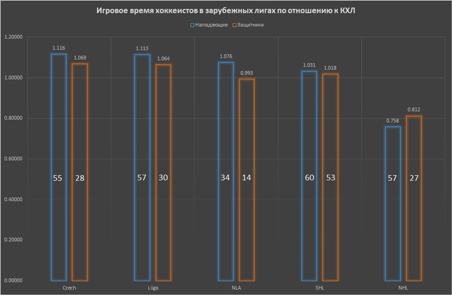 Исходя из таблицы видно, что в среднем нападающие, которые в КХЛ имели 1 минуту игрового времени, в чешской Экстралиге получили 1.116 минуты, а в НХЛ – 0.758 (и так далее – по аналогии). Числа, расположенные в середине столбцов, показывают количество игроков в выборке (сразу бросается в глаза небольшое количество защитников NLA, что чревато погрешностями).