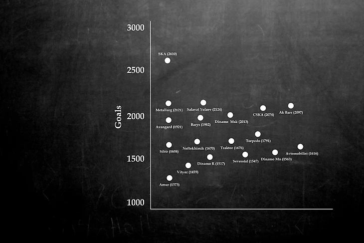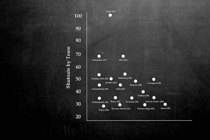 Ожидаемо внизу мы находим Витязь, два иностранных Динамо, Амур, далее пласт крепких середняков – Нефтехимик, Северсталь, Автомобилист, Сибирь, Торпедо, Трактор и затесавшийся туда бразильский хоккей Салавата и Барыса. Граница в 50 сухарей очень четко отделяет топ клубы от остальных. Авангард, Ак Барс, Динамо, Металлург показывают стабильно высокий уровень игры, и как следствие - обороны.