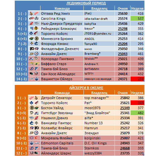 Потом плей-офф (10 недель). В плей-офф выходит 8 команд от АЙСБЕРГОВ и 9 команд от ЛЕД ПЕРИОДА.