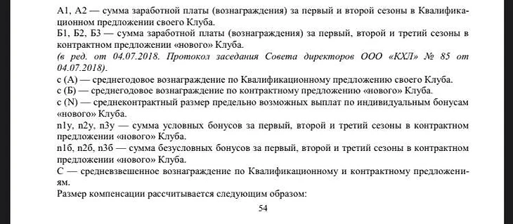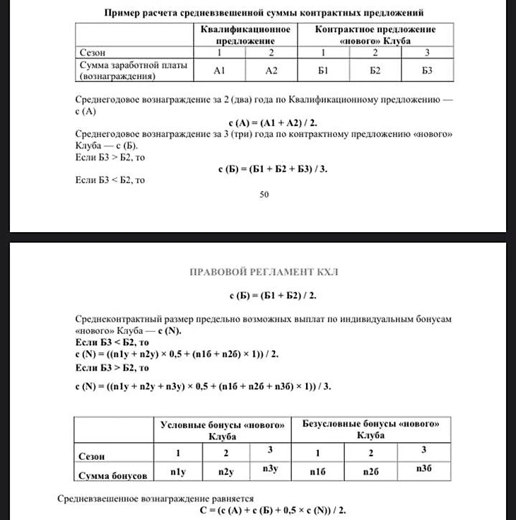 49,55 - это компенсация, но это ещё не все. В самом начале мы установили, что хоккеисту 25 лет и ему сделали квалификационное предложение в размере 47,5 и 49 миллионов за каждый сезон соответственно, а это 105 и 110 процентов по сравнению с прошлой зарплатой (мы поним, что он у нас получал 45 миллионов по последнему контракту). Теперь находим подпункт З пункта 5 статьи 43, где сказано: «если «старый» Клуб делает Хоккеисту в возрасте от 24 до 29 лет, заработная плата которого за последний год завершающегося Контракта составляет 30 млн руб. или более, Квалификационное предложение, согласно которому сумма заработной платы (вознаграждения) за сезон составляет 105% и 110% (на первый и второй сезоны соответственно) или более от суммы зп, то компенсация должна составлять два средневзвешанных значения».