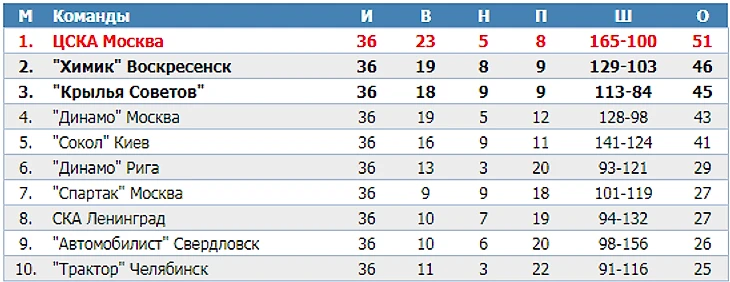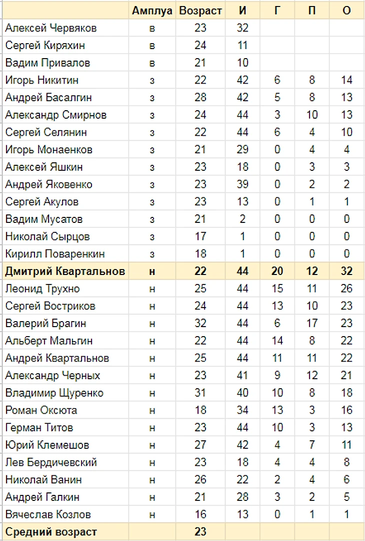 Средний возраст - 23 года, 14 игроков "Химика" находилось в возрасте 21-23 лет, в том числе лучший бомбардир команды 22-летний Дима Квартальнов. То есть в нынешней КХЛ тот "Химик" был бы самой молодой командой. Знаете, какое место заняла команда в чемпионате СССР? Смотрите следующую табличку: