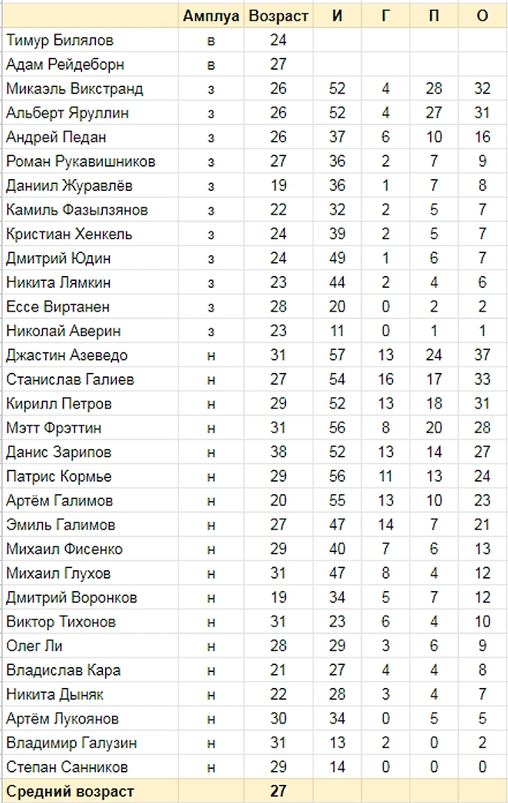 Давайте теперь посмотрим состав "Ак Барса" в прошлом сезоне: