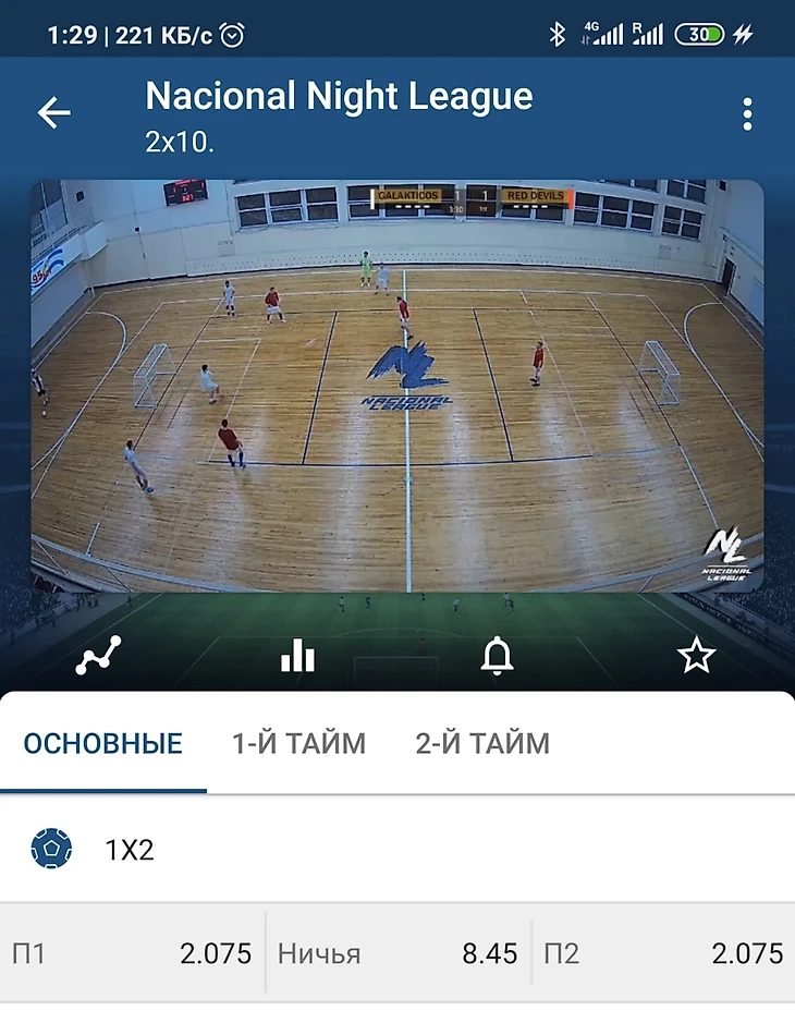 Данный вид игры уже более приближен к футзалу, стандартная площадка и ворота.Но есть один интересный факт, если обратите внимание на время (в левом верхнем углу скриншота), данный матч проходит глубокой ночью и в середине рабочей недели (я сделал этот скриншот в четверг ночью). Матч проходит в Бресте, время совпадает с московским, вот такая вот любовь у ребят к футболу, что в будние дни они готовы в пол второго ночи гонять мяч, а рано утром видимо пойдут на работу ))) Кроме как мотивации от букмекера или собственной выгоды, у меня нет других объяснений почему данный матч проходит такое время.