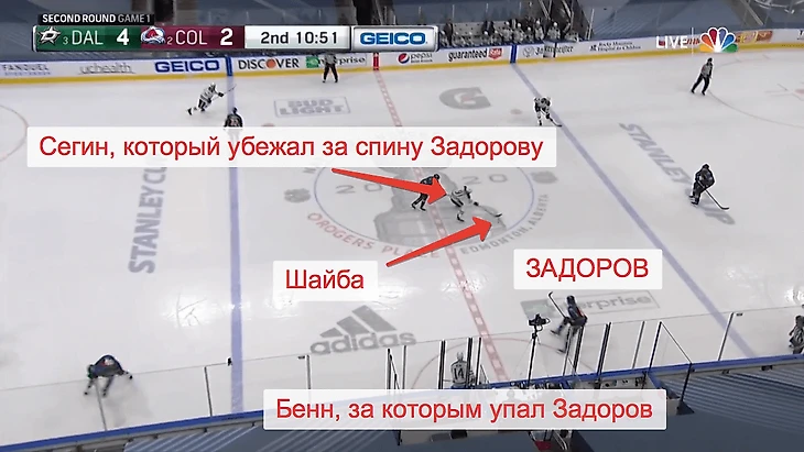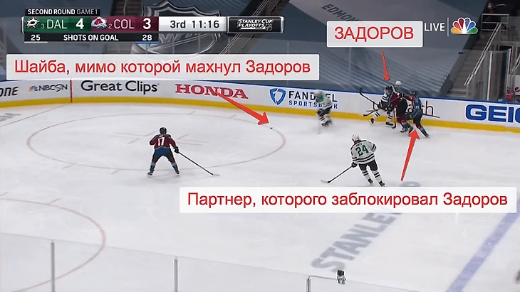 В первой шайбе вины Задорова нет от слова совсем, Колорадо всегда играет в высокий прессинг и, когда Кадри потерял шайбу под прессингом Сегина, задачей Задорова и было выдвинуться на Бенна, для предотвращения прохода того по флангу. А вот то, что засланный в Колорадо шведский казачок Бураковски, который и должен был накрывать в центре открывшегося туда Сегина, на кой-то хер сначала скинул скорость и проспал рывок Тайлера, а затем просто не побежал накрывать Радулова, просто катясь на прямых ногах за 47-м (тот и сам ехал на прямых ногах и Андре,сделай он ещё два-три отталкивания, спокойно его доставал, и мог просто не дать забрать отскок Александру на чистом льду) - это вопрос к гениальному менеджменту лавин, ведь ещё в Вашингтоне было видно, что швед вообще не любит отрабатывать в обороне. Для особо одаренных авторов в трансляции матча режиссеры специально сразу после этой шайбы показали крупным планом виновника торжества Далласа - именно Бураковски, а не Задорова.