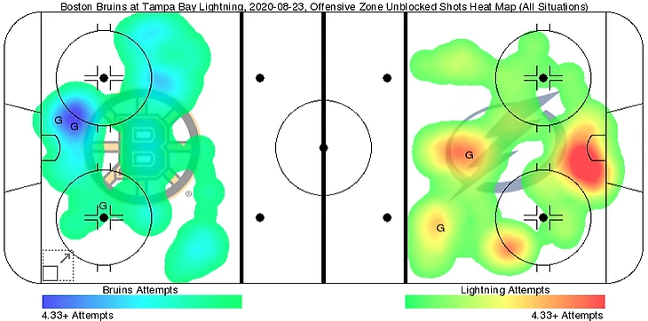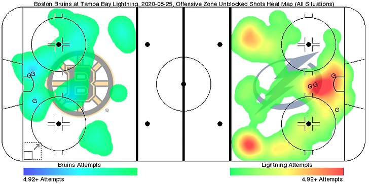 У этой корректировки стиля было еще одно важное последствие – посмотрите на карту бросков «Бостона»: сегодня он был немного, но менее опасным. Он меньше бросал и меньше атаковал – сегодня «Бостону» было намного сложнее, чем позавчера. Это именно то, чего и добивался тренер «Тампы», и его команда победила несмотря на отмененный гол, несмотря на пропущенную шайбу в самом конце основного времени.