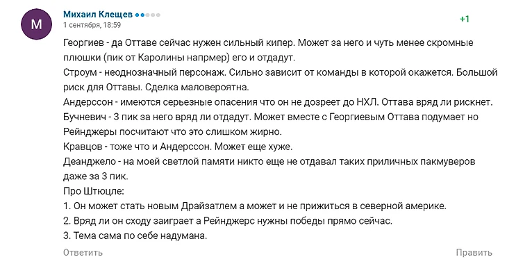 10. Неверие в целесообразность подписание любого центра, который через два сезона не сможет играть в первой тройке. Предложение о необходимости рассмотреть возможность обмена с Оттавой и выбор Штюльце соответственно.