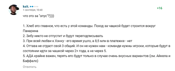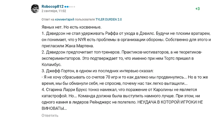 3. Разумеется, тема надумана в смысле, что любая тема задумывается автором. Если надумана в смысле вероятности события, то надо чётко разделять сожаления, желания автора статьи и обоснованные предположения возможных обменов и действий. Сожаления - это подписание Панарина, Трубы и Крайдера, деятельность Гортона на посту ген. менеджера и Куинна на посту главного тренера. Желание - увидеть пинок Гортону и Куинну от владельцев НЙР.