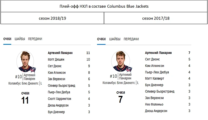 На картинке видно, что Панарин набрал больше всего очков за Коламбус в сезонах 2018/19, 2017/18. Но посмотрите на отрыв Панарина от преследователей и вспомните суммы контрактов этих хоккеистов.