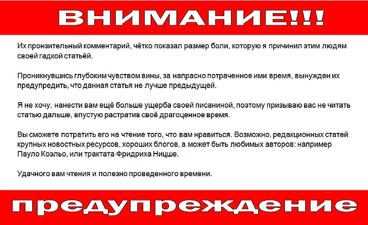 Смешно и удивительно, как некоторые плюсовали такие вердикты. Интересно, эти люди подумали над смыслом тех гениальных фраз, которые они плюсуют? Хорошо, что таких "особенных людей" в сотни раз меньше, чем прочитавших статью в блоге.