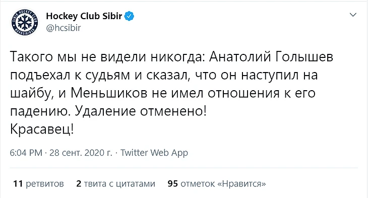 В сегодняшнем матче против новосибирской "Сибири" игрок "Автомобилиста" Анатолий Голышев объяснил арбитру, что нарушения со стороны соперника не было (нападающий сам наступил на шайбу) и предотвратил удаление игрока Сибири! Это невероятно редкий случай в хоккее. Отметим, что команда из Екатеринбурга по итогу матча уступила со счётом 4:6. Кто знает, как бы сложился матч, если бы не поступок Голышева. Но это совсем не важно! Браво, Анатолий!