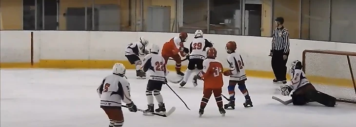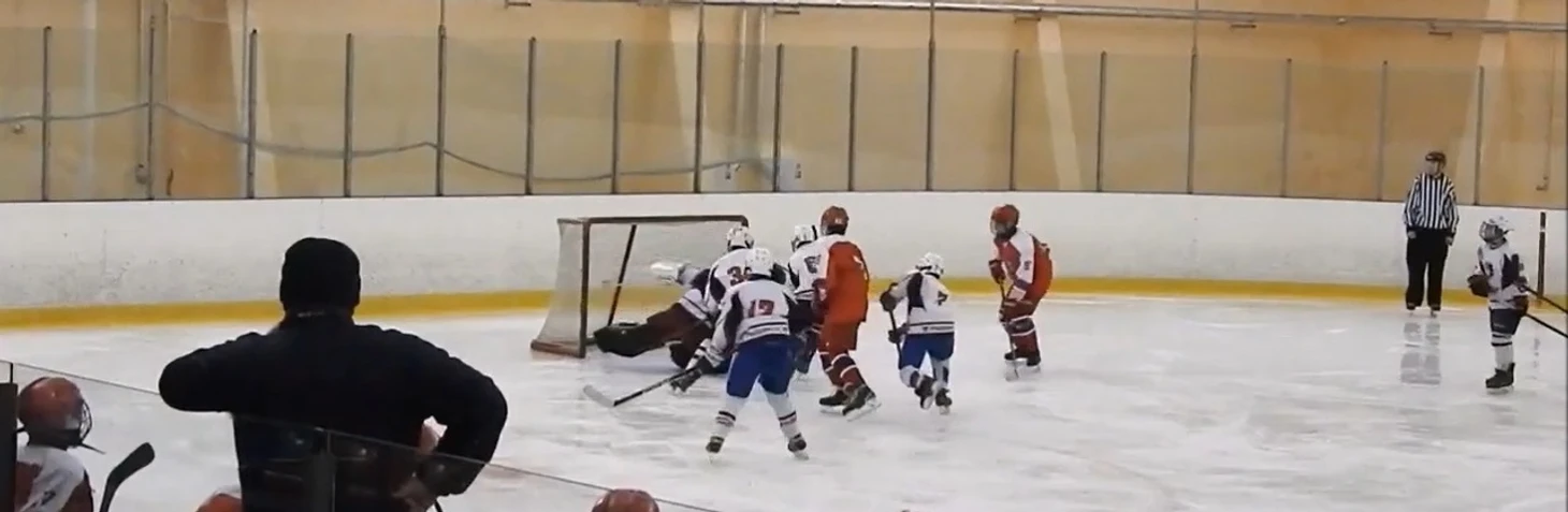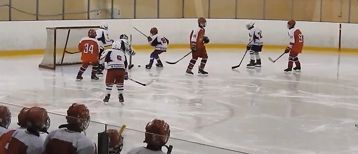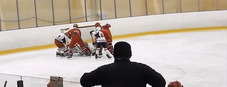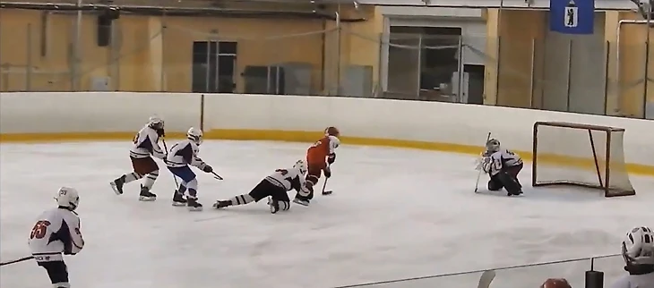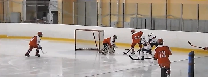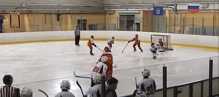 Так или иначе, ближе к середине периода моменты у наших ворот стали возникать с завидной регулярностью. Причём большинство бросков оранжевые наносили с дистанции в метр-полтора, и Балдыч отбивал их порой, хоть бы как, в последний момент. В одной из атак он исполнил футбольного вратаря, вылавливая шайбу, пущенную с добивания в противоход. Но время шло, а пятый гол в наши ворота так и не заходил, что немного успокаивало паникёров, настраивавшихся после первого периода на двузначный счёт. Мы поиграли в большинстве, проведя его в своих владениях, а за 4 с небольшим до конца случайно закатившийся в чужую зону Макар Крамаров получил силовой приём и ударился головой об борт. Арбитры, недолго думая, выписали большой штраф. Если говорить откровенно, на него нарушение не тянуло. Но это проблема разновозрастных матчей – мы только начинаем силовой хоккей, по сути, не начали даже. И не готовы к атакам у борта с ходу. Поэтому небольшого касания плечом достаточно для неприятного столкновения или даже травмы. Конечно, судьи в таких ситуациях всегда будут перестраховываться и наказывать старших. В конкретно этом эпизоде Макар повернулся к защитнику спиной, приближаясь к борту, чего, я надеюсь, больше не будет делать никогда. И совсем не был готов к борьбе. Хорошо, что всё не закончилось серьёзной травмой, через смену наш 30 уже был на льду. Мы же получили 5 минут, и практически сразу начали серьёзный навал на ворота соперника – сначала Яковлев атаковал с правого края, на добивание чуть-чуть не успел Ремизов. Затем тот же Яковлев нашёл отличным пасом на пятаке Кузьменко, Даниил бросил в касание, но точно в переместившегося кипера. «Ярославич» с трудом выбросил шайбу из зоны и всей четвёркой побежал меняться. В это мгновение Балдыч отдал пас Стасу Сергееву, а тот сразу же доставил шайбу на синюю Ремизову. Ярослав имел возможность убежать 1 в 0, сделай Миша передачу ему сразу. Но и так получалось довольно опасно – наш капитан резким торможением оставил не у дел догоняющих, но бросил прямо во вратаря. Неплохо! Выходит на лёд второе звено… и мы сразу же пропускаем пятый. Миша откровенно зевнул шайбу в стиле Боброва, но и защитникам стоит попенять на себя – по ходу развития атаки забрать себе диск можно было много раз. Под самую сирену вторая пятёрка создаёт свой первый и единственный момент, в быстрой контратаке Дудоров скидывает на накатывающего Жилкина, но бросок Михаила не застаёт вратаря соперника врасплох.