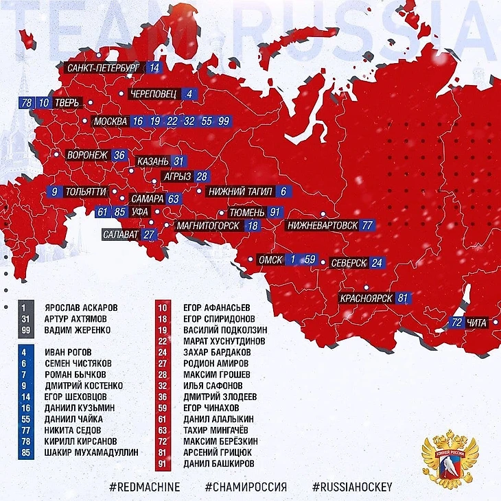 15:10 Хоккей России знакомит чуть ближе с составом сборной России – выпустил специальную карту с родными городами игроков нашей сборной.