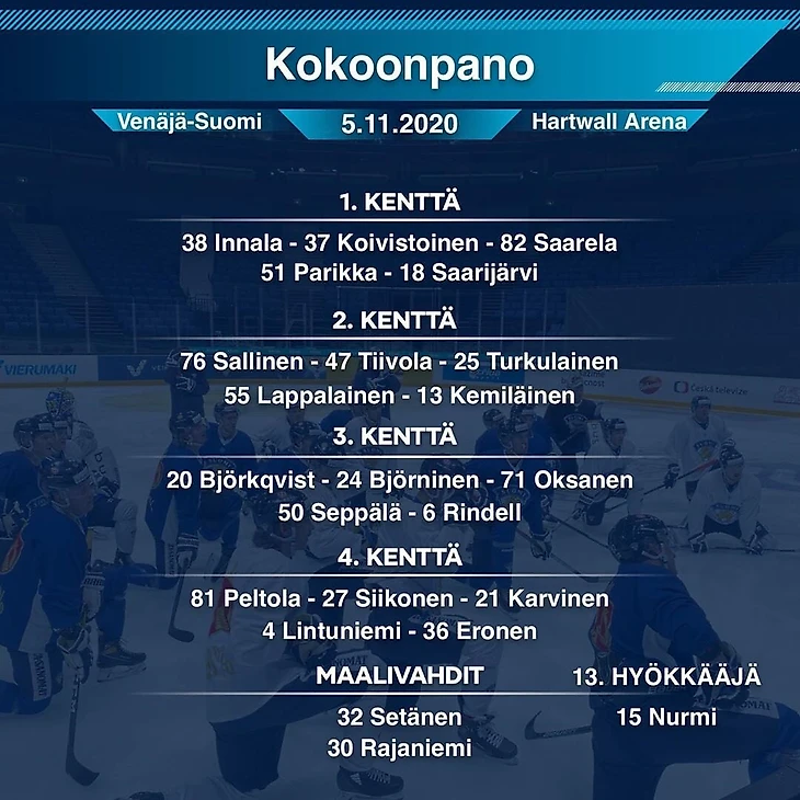 18:32 Состав Финляндии. На всякий случай напомним, что средний возраст их команды – 25,7 лет, нашей – 18,7.