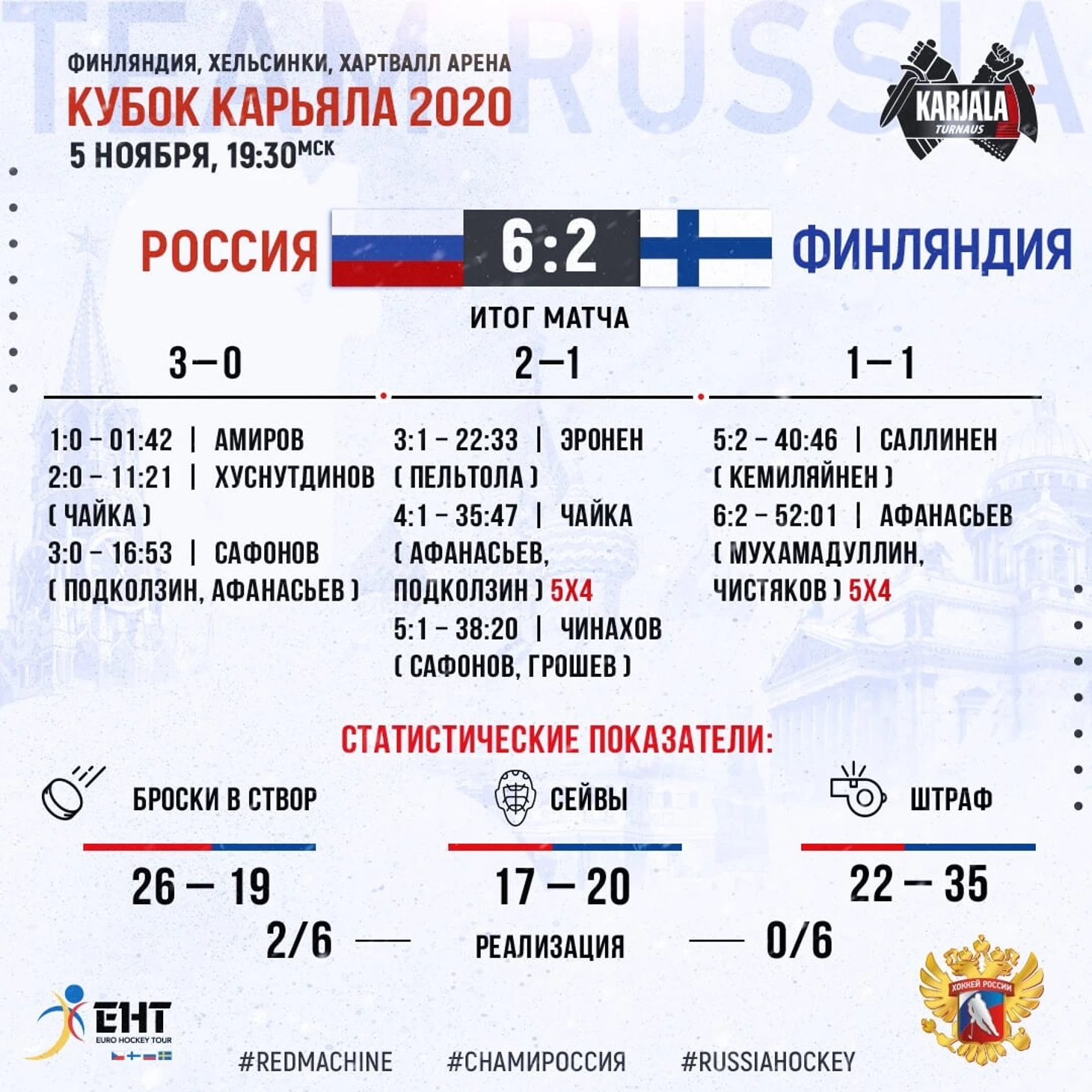 Сегодня – первый матч против сборной Финляндии на Кубке «Карьялы». Начало – в 19:30 по московскому времени. Игру будет в прямом эфире транслировать «Матч ТВ», но ее можно будет посмотреть и через плеер телеканала прямо здесь, в этом посте.