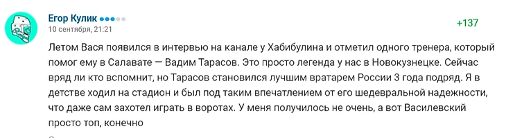 Андрей Василевский прямо сейчас — лучший вратарь России. И после его слов становится очевидно, что таким он стал во многом благодаря работе с Вадимом Тарасовым. Без таланта не добиться такого успеха, конечно, но очень важно этому таланту дать толчок. И Тарасов смог это сделать.