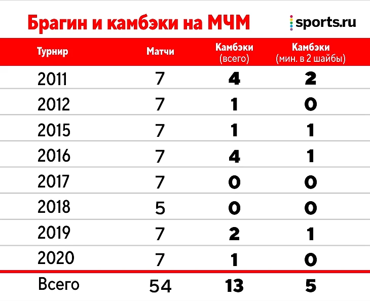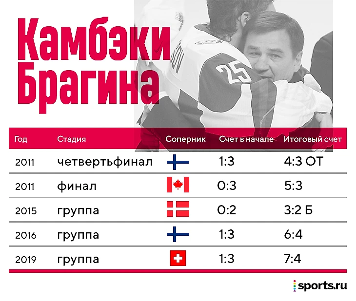 По центру таблички – впечатляющее подтверждение того, что Брагин тренировал безумно волевые команды. Да, среди этих 13 камбэков два – против Дании (в группе и плей-офф), а еще один – против Швейцарии в группе, но все равно стоит признать: воля к победе у молодежек с Брагиным – совсем не преувеличение.