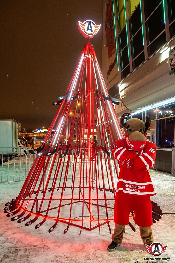 Перед КРК «Уралец» екатеринбургская команда установила ёлку. Но она непростая – ёлочка полностью состоит из клюшек! 84 клюшки прикрепили к железной опоре, украсили гирляндой, на верхушку надели звезду с логотипом «Автомобилиста».