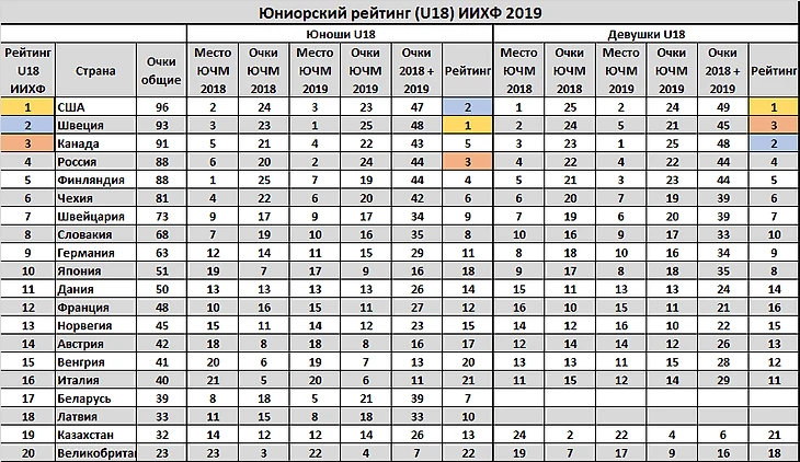Юниорский рейтинг составляется по итогам чемпионатов мира по хоккею среди юношей и девушек двух недавних лет. В настоящее время это годы состоявшихся чемпионатов U18 - 2018 и 2019. Очки начисляются в порядке убывания, так что команда с самым высоким местом в чемпионате получает 25 баллов, а 25-й получает одно очко. Страны, которые не вошли в топ-25 или вообще не участвовали, не получают баллов.