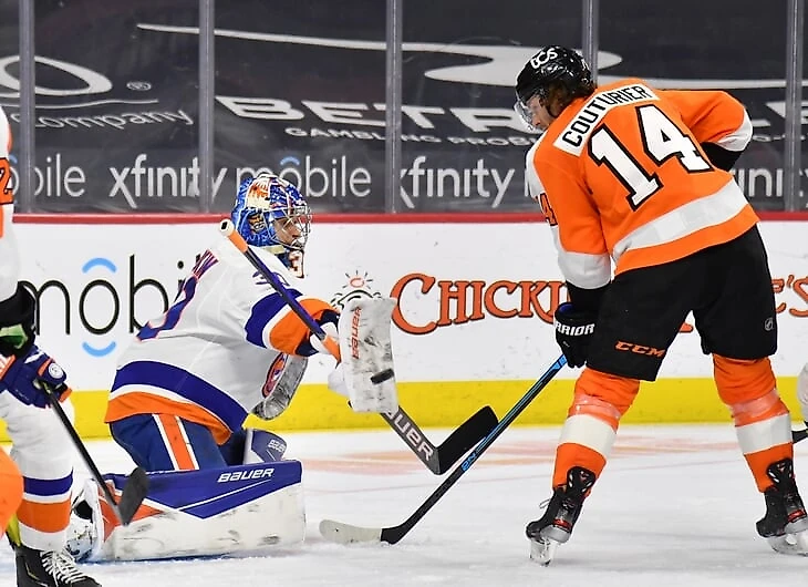 В первом матче в лиге Сорокин дебютировал неожиданно – из-за травмы Семена Варламова на раскатке. И получил 5 шайб от «Рейнджерс». Сегодня – взял 36 бросков от «Филадельфии» и одержал восьмую победу подряд.