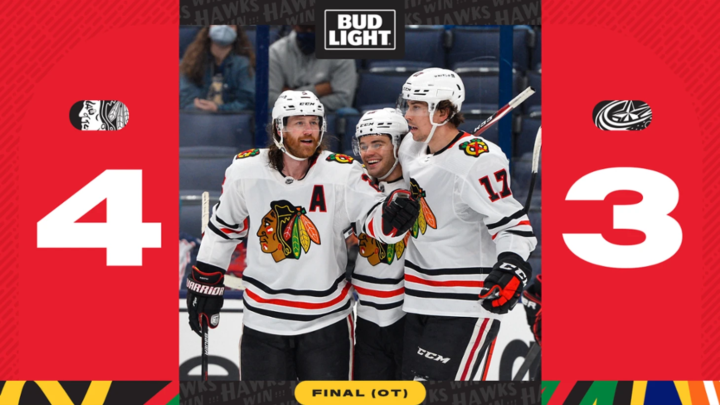 "Колумбус Блю Джакетс"-"Чикаго Блэк Хоукс" 3:4 (ОТ).Брендон Хагель в овертайме принёс победу гостям.Патрик Кейн отдал 2 результативные передачи,Кевин Ланкинен отразил 30 бросков.У хозяев Патрик Лайне забросил 2 шайбы,Владислав Гавриков отдал результативную передачу.