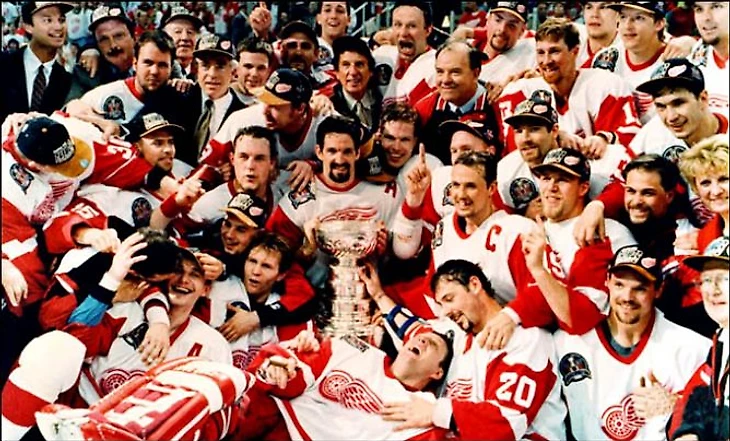 Итак, в середине 90-х в "Детройте", наконец, собрался коллектив, способный решать серьёзные задачи. Под стать коллективу нашёлся и тренер - Скотти Боумэн. Первый "заход на цель" был произведён в 1995-ом году. "Крылья" уверенно выиграли регулярку. Затем столь же уверенно зашагали по лестнице плей-офф, проиграв в первых трёх сериях лишь два матча. А затем был финал, попадание в "дьявольский" капкан", поражение 0:4. На следующий год команда ещё более уверенно, чем год назад, прошла по регулярке, а вот в плей-офф начались проблемы. И если первые два раунда "Крылышки" с трудом, но прошли, то, встретившись в полуфинале с "Колорадо", "Детройт" уступил. Команда, и прежде всего, Скотти Боумэн, сделала правильные выводы из поражений. Была сформирована "русская пятёрка", в результате трейда был приобретён Брендан Шенахан... Не маловажный момент - Скотти Боумэн заставил Айзермана возвращаться в оборону. В сезоне 96-97 "Ред Уингз" не рвали всё и всех по ходу регулярки, а спокойно вышли в плей-офф со второго места в дивизионе. А вот в играх навылет франшиза стала потихоньку прибавлять. И, в конце концов, уверенно разобралась с "Филадельфией" в четырёх матчах финала.