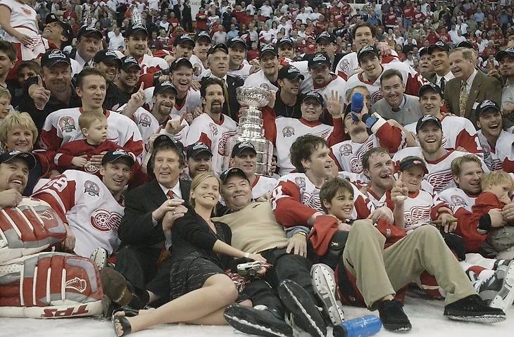 Сезон 2001-2002 год. Локаут, после которого на Лигу "опустится потолок" зарплат, начнётся через 4 года. А пока команды (кто, конечно, может себе позволить) шикуют на всю катушку. Перед началом сезона "Детройтом" подписаны "ветераны со звёздными именами" - Бретт Халл, Люк Робитайл и, самое главное, Доминик Гашек. Они очень сильно помогли в походе за новым трофеем. Серии с "Ванкувером" и, особенно, с "Колорадо" складывались очень непросто, но "Детройт" дожимал своих соперников. В финальной серии впервые ворота команд защищали вратари - европейцы - чех Гашек - у "Детройта", латыш Артур Ирбе - у "Каролины". Противостояние началось с победы "Ураганов", однако, затем "Ред Уингз" взял ситуацию под контроль. Ирбе не пропускал более трёх шайб за матч, но "Крыльям" этого хватило. 4:1 - на улицах Детройта очередной парад чемпионов.