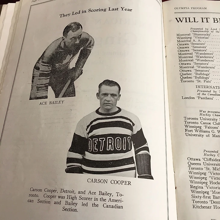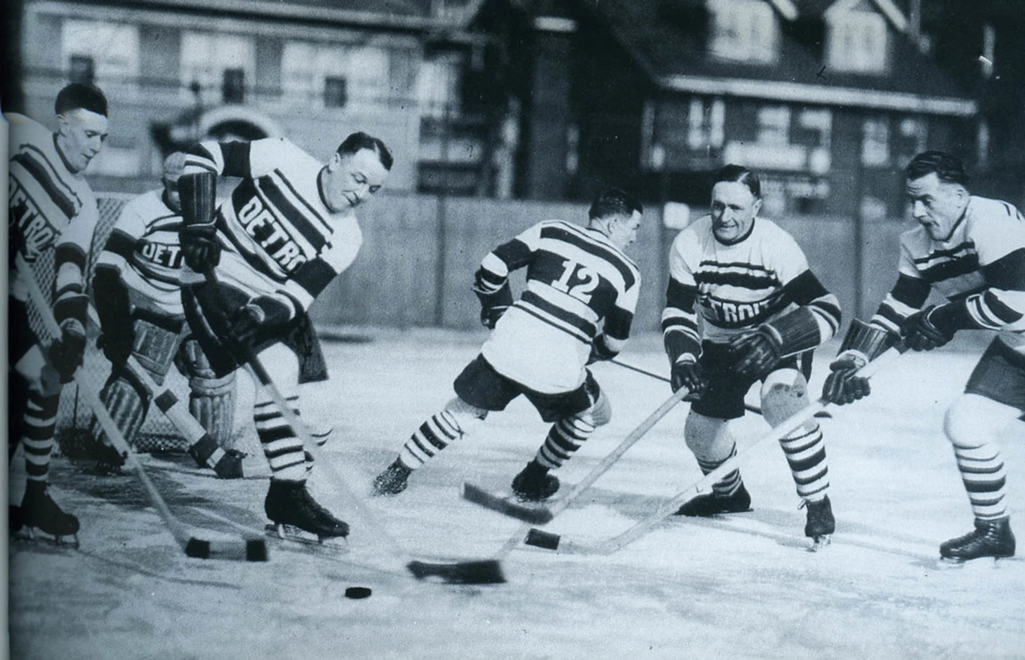 Цвета ливреи были выбраны красно-белые, что, конечно, на чёрно-белом фото определить не возможно, но поверьте, что это так. Предполагалось, что команда будет проводить свои домашние матчи на стадионе "Детройт-Олимпия", но к старту сезона 1926-1927 арена не была готова и пришлось играть через дорогу речку, а можно сказать - через границу. Река Детройт - река пограничная, она протекает из озера Лэйк-Сент-Клэр в озеро Эри (система Великих озёр, как Вы понимаете) и разделяет Детройт (территория США) и канадский город Виндзор. Вот в Виндзоре и отыграли домашние матчи своего первого сезона в НХЛ хоккеисты "Детройта". Успехов особых не добилась, заняв последнее место. На следующий сезон в клубе произошло несколько знаковых событий. Во-первых - франшиза наконец-таки добралась до дома, которым стала для него, до 1979-го года, арена "Детройт-Олимпия".