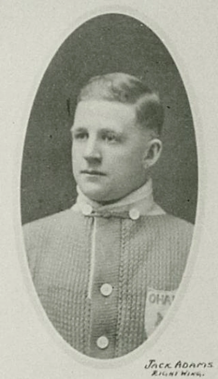 Фотография, приведённая выше, была сделана в 1918-ом году, когда Адамс играл за команду "Торонто Аренас" и выиграл свой первый Кубок Стэнли. То была вообще первая победа команды НХЛ в Кубке Стэнли. После этого Адамс ещё раз выиграл Кубок как игрок, в 1927-ом году, в составе "Оттава Сенаторз". В том же году Джек Адамс закончил карьеру игрока и, по рекомендации президента НХЛ Фрэнка Колдера, Чарльз Хьюз пригласил его в "Детройт Кугарз" на должности Генерального менеджера и главного тренера. Следующие 36 лет судьбы "Детройта" и Джона Джеймса "Джека" Адамса будут неразрывно связаны. Он станет лицом франшизы. Трижды выиграет с клубом Кубок Стэнли в сдвоенной должности главного тренера и Ген.менеджера, а ещё четырежды, оставив пост главного тренера, в роли исключительно Генерального менеджера. В 1974-ом году в Лиге учреждён приз лучшему тренеру по итогам сезона, и назван этот приз в честь легенды "Детройта" - "Джек Адамс Эворд".