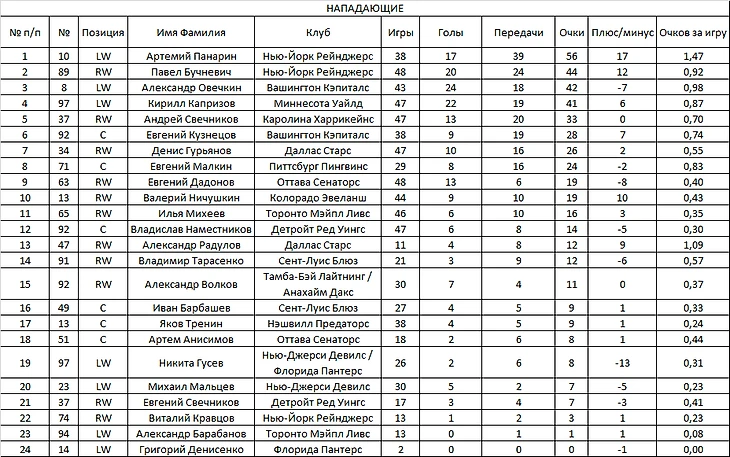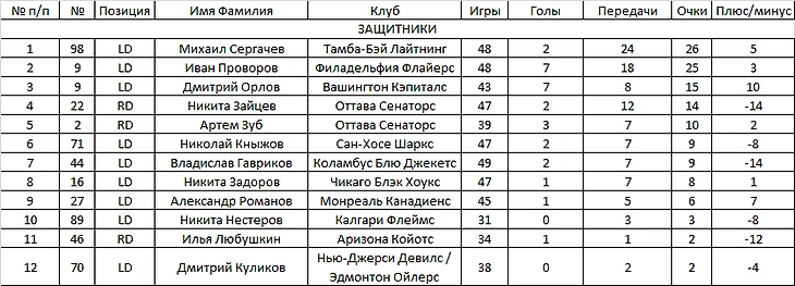В этой таблице теперь четко бросаются в глаза (только мне или вам тоже?) громадные минусы в последнем столбце. Зайцев и Гавриков (по -14), Любушкин (-12), Кныжов и Нестеров (по -8) имеют такие показатели, что суммарный плюс/минус у защитников-россиян упал до -32.