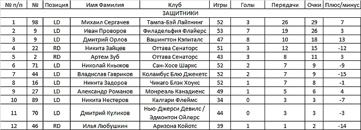 В символическую сборную недели (ну или 9 дней - так точнее) входят два защитника, играющих слева, так как другого выбора просто нет. За прошедшее с прошлого поста время 12 российских защитников набрали 10 очков, из которых 6 на счету Михаила Сергачева и Дмитрия Орлова (у обоих по 4 игры, 1+2, +2 и +3 соответственно).