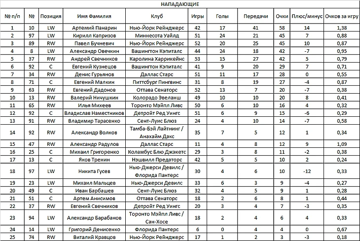 Слева - главная (или единственная?) неожиданность - Александр Барабанов! 5 матчей, 2+3, +3 - это естественный всплеск адреналина после обмена или игрок просто нашел свою команду? Посмотрим в ближайших матчах (хотя, пожалуй, вероятнее уже в следующем сезоне), надеемся на дальнейший прогресс, ведь Саша - игрок очень высокого уровня, не хотелось бы его в следующем сезоне видеть в КХЛ.