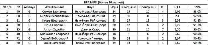 Настала очередь Семена Варламова, проводящего феноменальный сезон, отметиться не менее феноменальным процентом отраженных бросков - 93%. Несмотря на отличную игру некоторых других наших киперов (например, разучившегося проигрывать Андрея Василевского), главным ньюсмейкером недели стал, конечно, Семен.