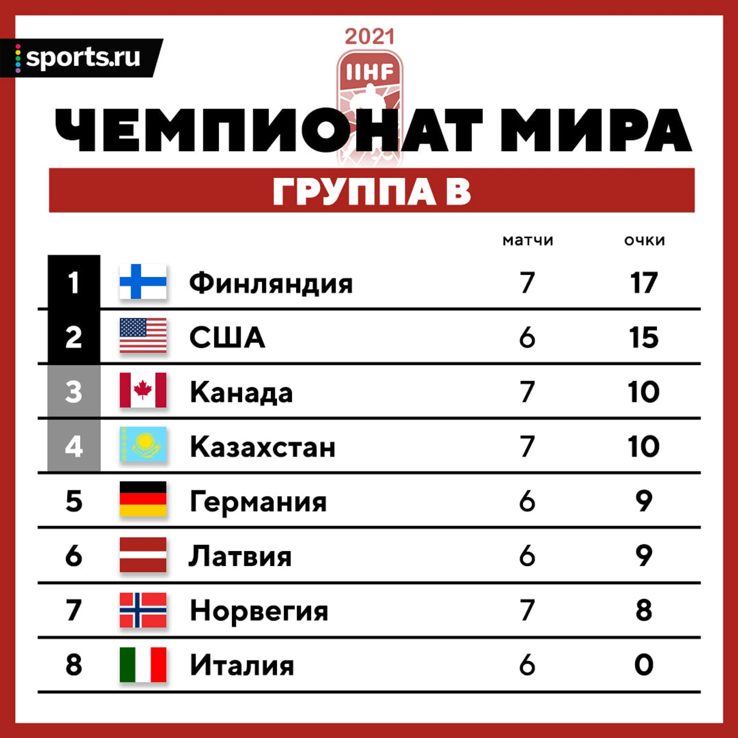 Если в основное время побеждает сборная Германии – она с 12 очками залетает на третью позицию, Канадцы – четвертые, Латвия и Казахстан вылетают.