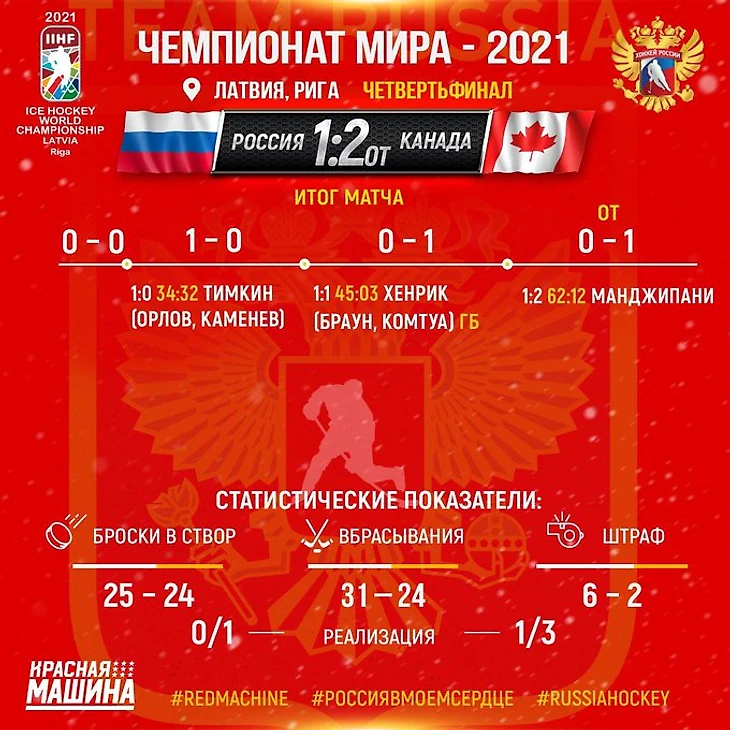 Россия едет домой с ЧМ-2021 без медалей: проиграли канадцам в овертайме четвертьфинала. Все голы матча – тут
