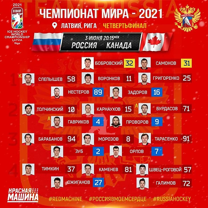 18:46 Состав сборной России на четвертьфинал с Канадой. Сергей Бобровский – основной, Самонов – бэкап, Бочарова нет в заявке. Во второе звено вернулись Толчинский и Каранухов – с ними Бурдасов. Галимов – 13-й нападающий, Шалунов не попал в состав.