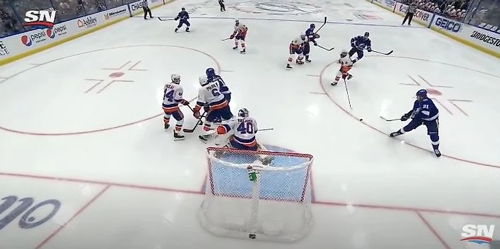 Достаточно посмотреть первую шайбу в ворота Варламова. Стэмкос катится абсолютно один, когда Сирелли зажимают аж двое - Пажо и Пулок, а сзади Пальмьери дважды позволяет шайбе ходить между Киллорном и Стэмкосом. И так всю игру. Игроки "островитян" просто где-то недоработали, где-то не помогли своему вратарю, а где-то, как в последней шайбе, рикошет от конька Пулока.