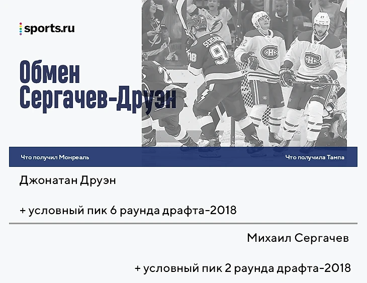 «Монреаль» отдал за Друэна еще и условный пик – если бы Сергачев сыграл менее 40 матчей в регулярке и плей-офф, «Лайтнинг» выбирали бы во втором раунде драфта, но этот пункт так и не был активирован, поскольку Михаил сходу заиграл в основе будущих чемпионов.