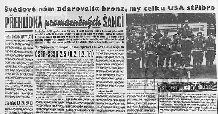 Чехословаки уступили американцам – 4:9 (0:1, 2:3, 2:5), в третьем периоде молодой чешский вратарь Ян Водичка в течение 25 секунд пропустил две шайбы подряд, когда его команда играла в большинстве, но это никому из них не помогло. Сборная СССР, дебютант зимних Игр, победила Канаду 2:0 и завоевала первое в нашей истории олимпийское золото.