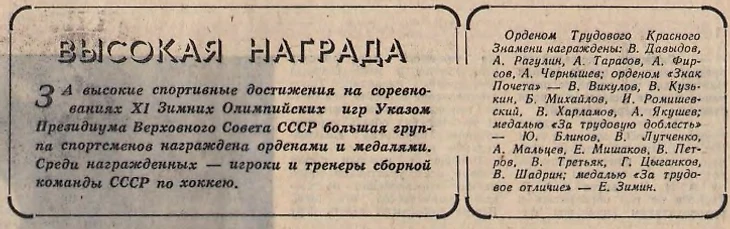 Заседание секретариата ЦК КПСС, на котором обсуждалось награждение победителей и призеров Саппоро, состоялось 16 февраля, вел его член Политбюро товарищ Кириленко, именной список к наградам готовил Спорткомитет, то есть Павлов, а одобрял его Петр Нилович Демичев, секретарь ЦК, курировавший вопросы идеологии, истории и культуры, ну и спорта тоже.