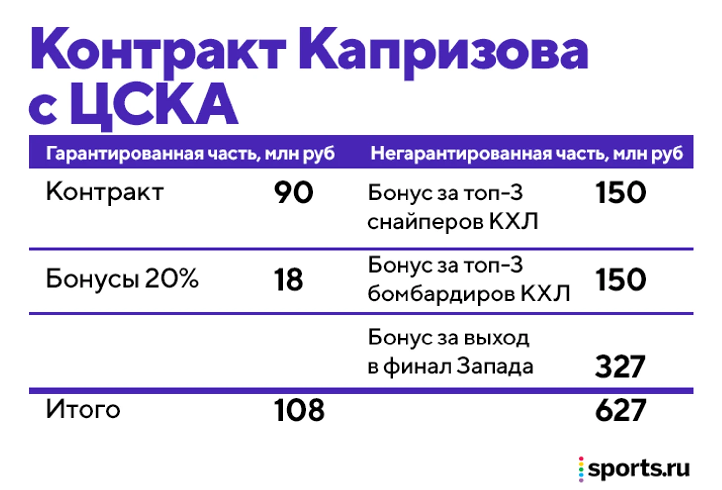 ЦСКА действительно может дать Капризову 10 млн долларов на один сезон. Но гарантирует из этой кучи денег примерно 1,5 (те самые 108 млн рублей базовой зарплаты и базовых бонусов).
