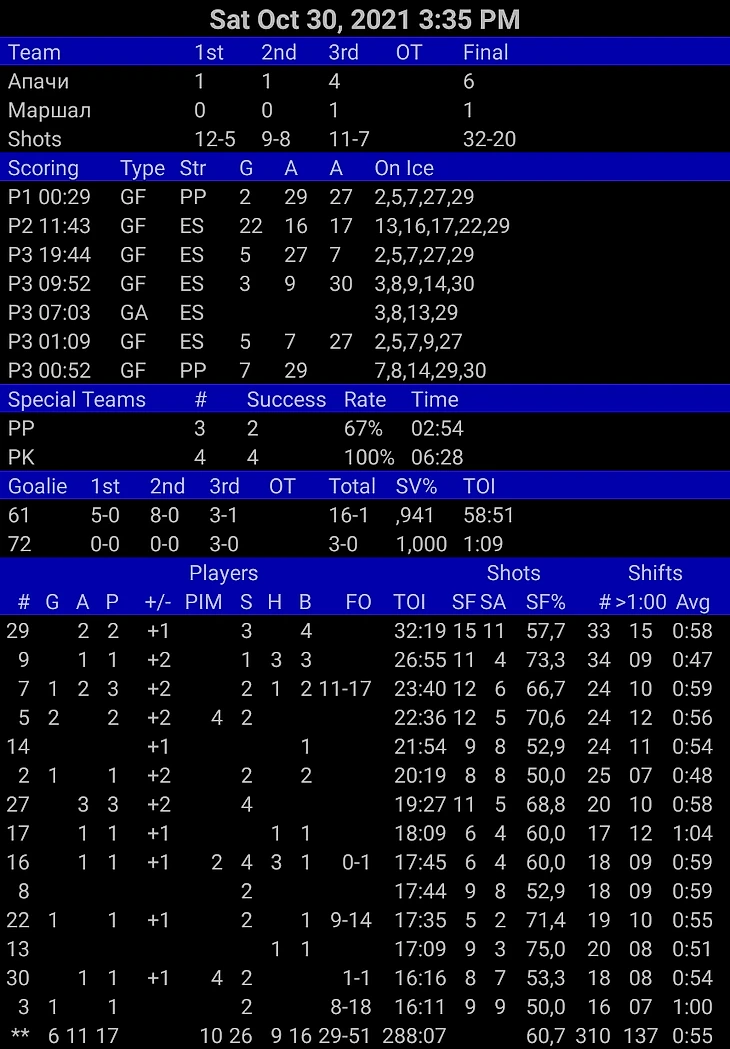 Жаль, не хватает пока времени заняться более глубоким анализом игр с выделением количества опасных моментов, потерь, перехватов и т.п., но надеюсь, что со следующих домашних встреч такие цифры извлечь получится. Я бы отметил, что всего один игрок у нас закончил матч со средним временем смены больше минуты. Это действительно прогресс. Мы здорово страховали друг друга, чистили ошибки партнёров, не паниковали, когда не шло. Плюс, практически ни разу не ошиблись на сменах, особенно трудно было защитникам, хотя опыт игры в 5 оборонцев у нас уже был. Из минусов – ужасное созидание, плохая игра в пас в атаке, ничтожно малое количество нормальных бросков и всё то же недоверие защитникам при игре в чужой зоне.