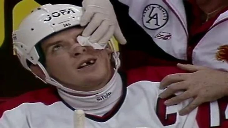 В детстве у меня не было ни одной травмы, если не считать того пореза на руке. И вот когда мне было 16 лет, мы отправились играли в Калгари на арене "Стампид Коррал" с местными "Уэрэнглс". Я стоял на пятаке, а один мой партнёр накатывался из угла. Он катился спиной ко мне и держал клюшку вверху, прося паса. Бац! Он заехал мне в челюсть, чуть ниже губы. У меня тут же откололись три передних зубы - выпали, словно ледышки.