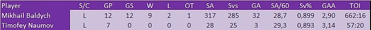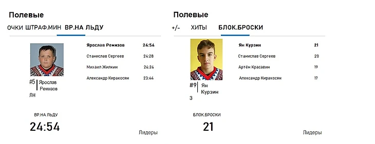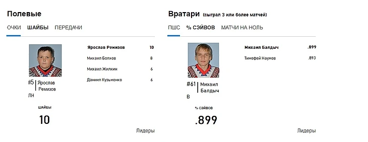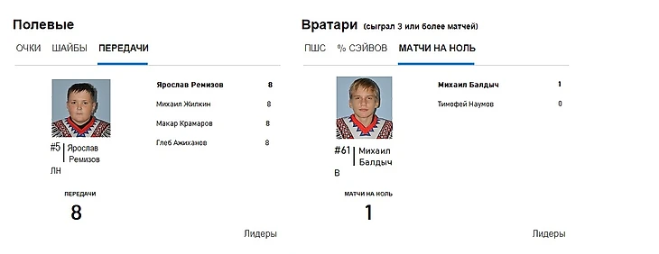 Спор в промежуточном ранге бомбардиров, снайперов и ассистентов у нас был нешуточный, и Ремизов лишь в последних играх немного оторвался от преследователей в двух из трёх номинациях. При этом не стоит забывать, что наш чистый снайпер, Миша Болхов, пропускал последнюю серию с Иваново. В списке ассистентов, тем не менее, сразу 4 игрока имеют одинаковое количество баллов. По вратарям проще - Балдыч вырвался в лидеры по всему чемпионату, если верить официальным протоколам, по коэффициенту непробиваемости, да и в целом наша пара на данный момент - самая надёжная в лиге. Сухарей так же у соперников до сих пор не было. И при этом у Миши он всего один. Ибо по классификации матч, в котором играло два вратаря, не может быть засчитан как сухой ни одному из них. Тима очень близко по всем показателям, только одна проблема - количество проведённого на льду времени.