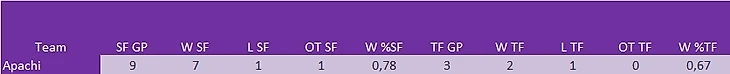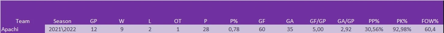 Ну и наконец, командная статистика. По первой картинке отмечу, что если бы Индейцы играли в НХЛ, то с такими показателями игры в неравных составах мы бы безоговорочно лидировали во всех рейтингах! У лидера большинства прямо сейчас - Эдмонтона - 30,2; меньшинства - Питтсбурга - 90,4. Казалось бы, что такое большинство в детском хоккее.... Но именно за этот показатель мы с ребятами бились ещё на заре эры Апачей. Отрадно, что тренерский штаб сейчас очевидно продолжает эту линию. Мы реализуем практически каждое третье большинство и нейтрализуем больше 9 из 10!!! Сокращения по столбцам: Команда, Сезон, Игр сыграно, Победы, Поражения, Поражения в Овертайме, Очки, %набранных очков, Голов забито, Голов пропущено, Голов забито в среднем за игру, Голов пропущено в среднем за игру, %реализации большинства, %нейтрализации меньшинства, %выигранных вбрасываний.