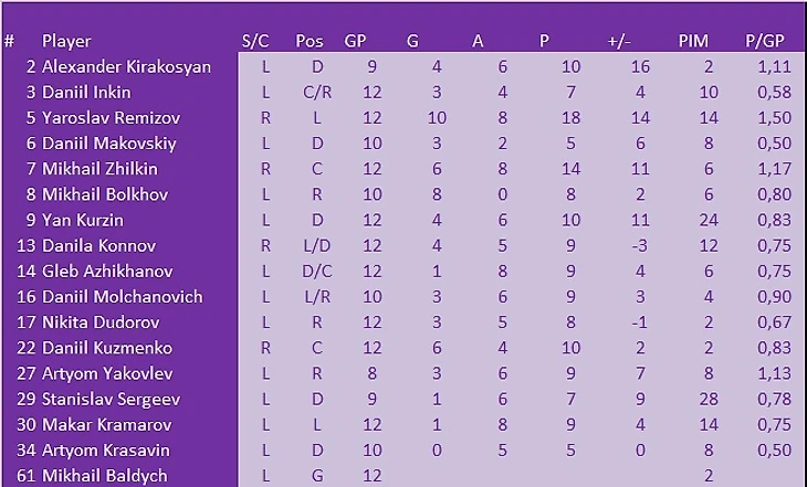 Общая картина непродвинутой статы ребят выглядит вот так. Отмечу, что почти половина игроков команды не отыграла чемпионат целиком. Отмечу, что Ян Курзин за последний матч набрал столько же очков, сколько за предыдущие 11. Отмечу, что у нас по-прежнему двое никак не могут выбраться из минуса. Отмечу, что сразу четверо Красавчиков набирают на данный момент больше очка за игру, и нет ни одного, кто бы набирал меньше одного за 2 матча. Сокращения по столбцам: Номер, Игрок, Хват, Позиция, Игр Сыграно, Голы, Передачи, Очки, +/-, Штрафные Минуты, В среднем Очков За Матч