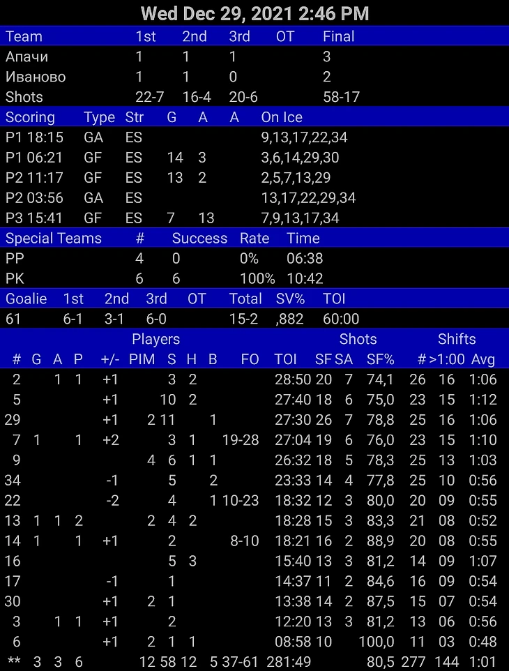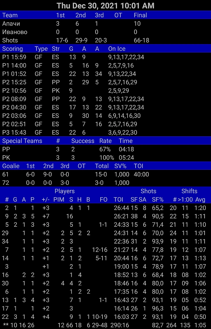 Итого по второй встрече – почти все индейцы набрали результативные баллы, мы вновь почти вчетверо перебросали соперника, Курзин попал в створ аж 16 раз, набрал 5 очков, находился на льду при 8 из 10 взятий ворот соперника и справедливо стал первой звездой матча. Наши вратари оформили первый на турнире комбинированный шатаут, мы впервые отличились в меньшинстве, и каждый полевой игрок закончил встречу с плюсовым показателем полезности. Красота!