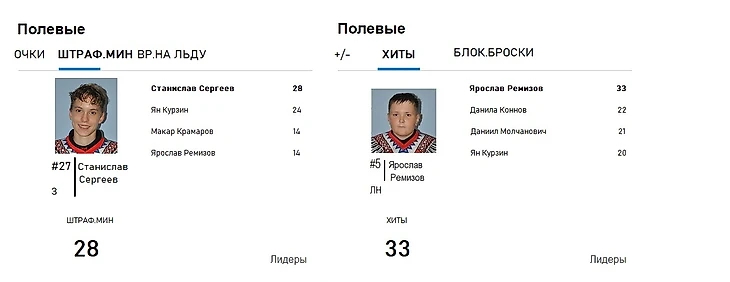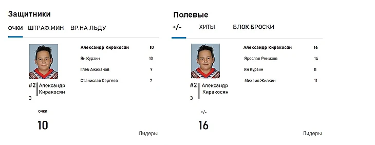 Идём дальше. Среди защитников по 10 очков у Курзина и Киракосяна, но Саша сыграл на 3 встречи меньше. Он же лидирует в команде по коэффициенту полезности, к этим цифрам мы ещё вернёмся позже. За счёт своей дисциплинарной 20 индейцем-убийцей пока остаётся Сергеев, но Стаса вполне вероятно скоро догонит Ян. Не радует, что в топ-4 по силовым приёмам только один чистый защитник, а отрыв Ремизова от остальных уже практически неотыгрываемый. По времени на льду всё очевидно, при этом лидерство капитана не такое серьёзное. А вот в списке самых самоотверженных индейцев, как и положено - сплошь защитники, и разница между ними не особо существенная.