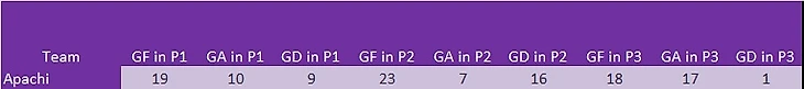 А вы знали, какой из трёх игровых отрезков у Индейцев лучший? Безоговорочно второй, по заброшенным шайбам и разнице забитых и пропущенных. Мало того, если убрать поражение в Ельце со счётом 0:5, то в оставшихся 11 матчах во втором периоде мы пропустили всего дважды! Третий же иногда лучше пропускать... Сокращения по столбцам: Команда, Голы мы в 1 периоде, Голы нам в 1 периоде, Разница шайб в 1 периоде, Голы мы во 2 периоде, Голы нам во 2 периоде, Разница шайб во 2 периоде, Голы мы в 3 периоде, Голы нам в 3 периоде, Разница шайб в 3 периоде.