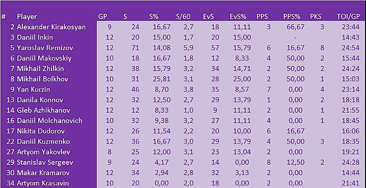 Что до бросков, то здесь очевидно лидерство капитана. Бросал, бросаю и буду бросать, это в целом неплохо. Ещё бы точность подтянуть. По этому показателю абсолютный лидер - Болхов, каждый четвёртый бросок в створ заканчивается взятием ворот. Что интересно - феноменальная точность бросков в большинстве у Киракосяна, а самый бросающий в большинстве уже не кэп - Сергеев и Курзин опережают №5. Ещё интереснее то, что Киракосян, Ремизов, Жилкин и Коннов в меньшинстве бросают не меньше, чем в игре с численным преимуществом. Сокращения по столбцам: Номер, Игрок, Игр Сыграно, Бросков в створ Всего, % Реализации бросков, Бросков в Среднем за Матч, Бросков в равных Составах, % реализации бросков в Равных составах, Бросков в Большинстве, %реализации бросков в Большинстве, Бросков в Меньшинстве, Время на льду в среднем за Матч.