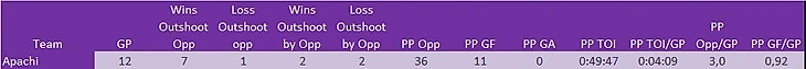 В меньшинстве мы отыграли уже больше 5 периодов, приближаясь к двум полным матчам. Само по себе это не здорово, но пока нам это особо не доставляет проблем. Сокращения по столбцам: Команда, Игр сыграно, Попытки в меньшинстве, Голы в меньшинстве, Забитые голы в меньшинстве, Время в меньшинстве всего, Среднее время в меньшинстве за игру, Среднее количество попыток в меньшинстве за игру, Голы в меньшинстве в среднем за игру.